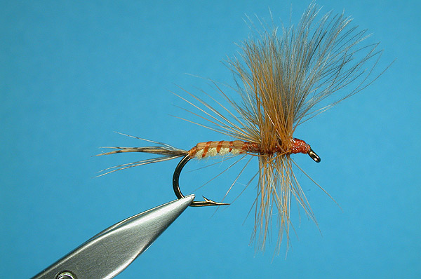 | Abdomen: | Tan beaver dubbing, topped by a small piece brown raffia |