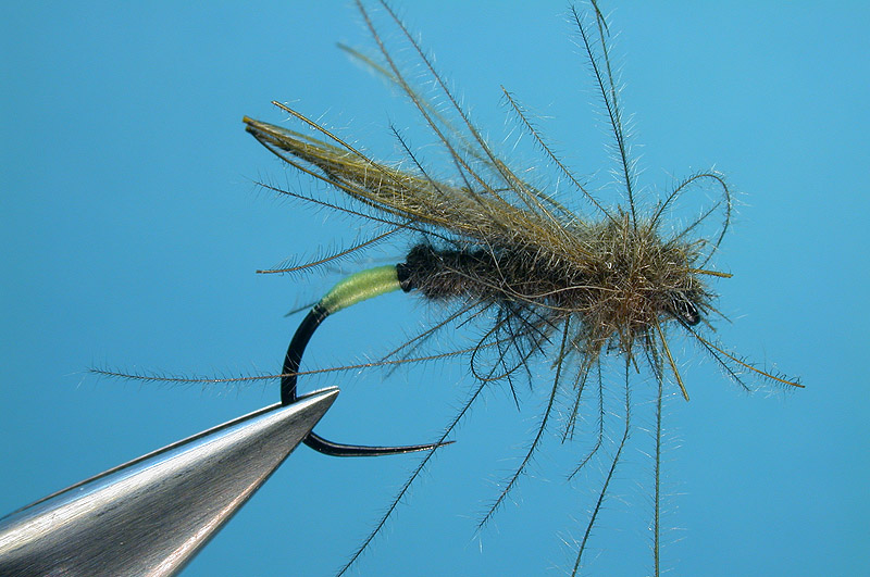 | Body: | A single CDC feather, dyed olive/brown (Petitjean Bistre) tied in the tip and twisted as it is wrapped |