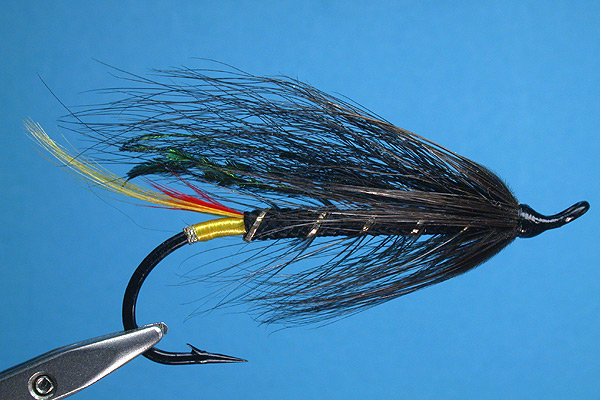 | Wing: | 4 strands of peacock herl, with black bucktail over. |