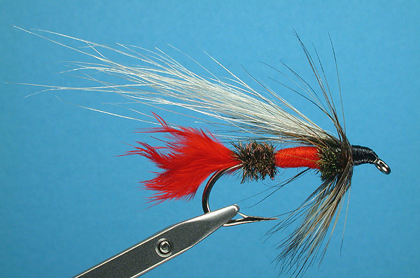 | Body: | peacock herl butt, red yarn center, and herl shoulder (close to coast run the red forward and forget the herl shoulder |