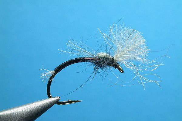 | Wing cover/wing: | 1-4 white CdC feathers, depending on hook size mixed with a few strands of white poly yarn pulled to each side of the thorax. Clip CdC square on top. |