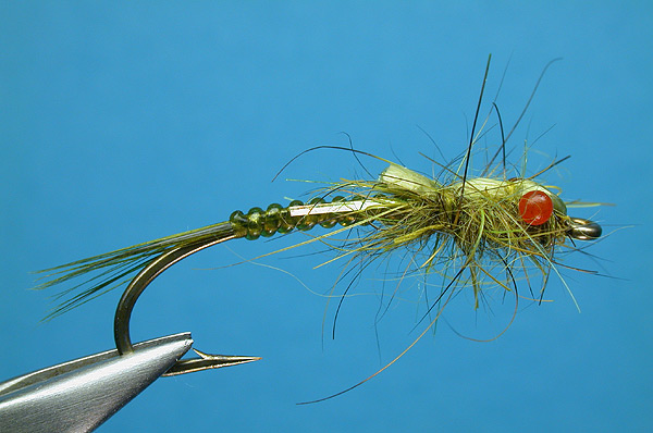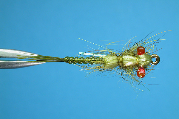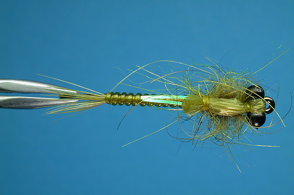 | Wing: | Mixture of pale olive squirrel and insect green SLF, tied buggy |