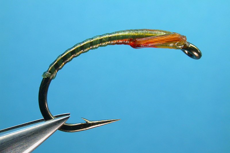 | Abdomen: | Chartreuse Spanflex plus one coat of clear and one coat of light red stained Sally to tone down the chartreuse |