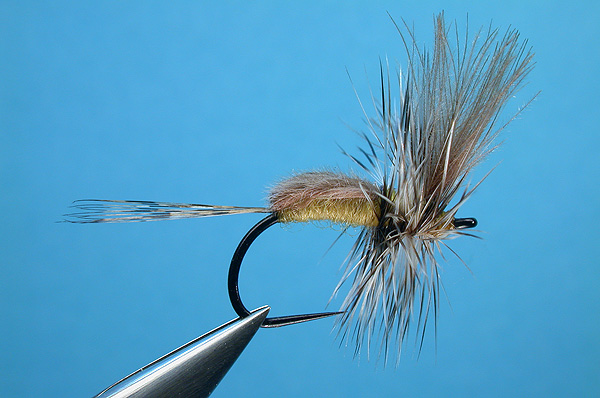 | Hackle: | Whiting Grizzly and Brown mixed |
