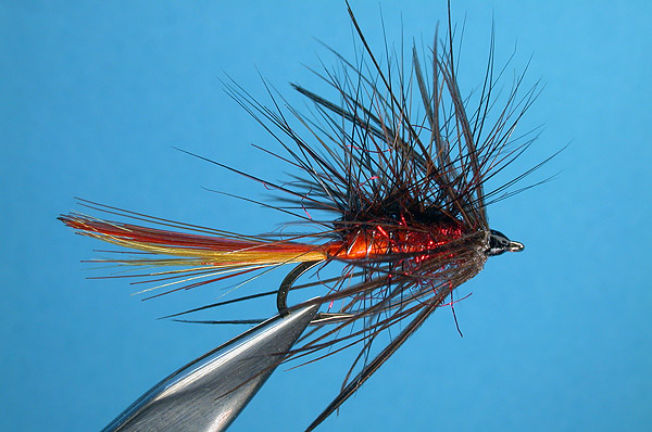 | Body hackle: | Red Indian Cock and Black paraloop style over abdomen |