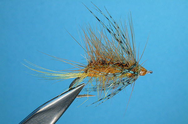 | Shoulder hackle: | Gold dyed medium ginger clipped flat on bottom |