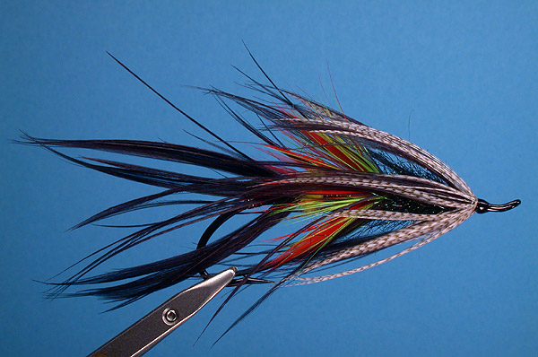 Red Saddle Hackle under Chartreuse Saddle Hackle under sparse Black-dyed Mallard Flank |