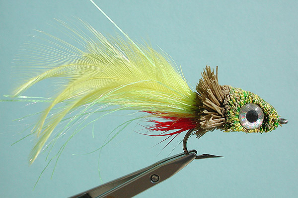 | Tail: | red deer belly hair, yellow hackle and green glow in the dark Flashabou |