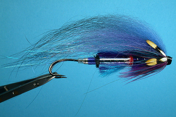 | Rear body: | flat silver tinsel veiled above and belowwith blue and light blue SLF hanks, in the middle the butt |