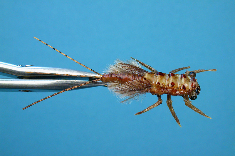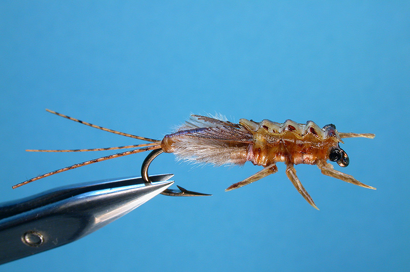 | Tail: | Brown rooster hackle quills, marker pen - black |