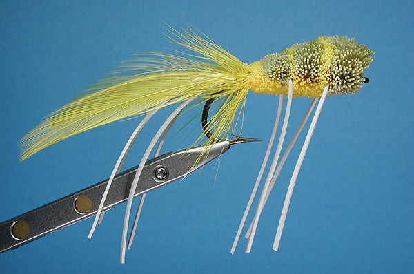 | Tail: | Four yellow saddle hackles and 4 strands white rubber hackle. Three turns of yellow saddle hackle |