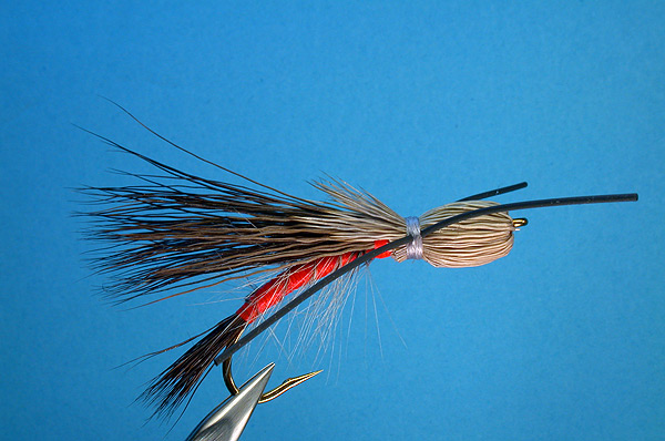 Note: I’ve always felt that these flies are called salmonflies because of their color, but most patterns I’ve seen are more orange. This fly started out life as an L.C. Moose, a pattern developed by two dentists here…I like the low riding characteristics of bullet-headed flies, and put one on this pattern. I still carry the original version, with several dun hackles at the front of the fly, for when the fish want something higher on the surface. |