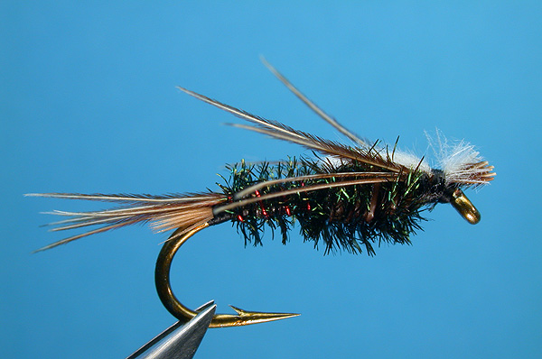 Note: I have to say that I can’t stand biots as wing cases or tails. They’re just too stiff. I’ve always liked the prince because of the peacock, but I had to do something different with the tails and wing buds, and this is it. The method of twisting the herl with wire to make a durable body was shown to me by Mike Lawson, and it’s now become my favorite way of using peacock. |