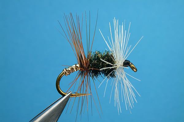 Note: This is probably the first fly I ever tied. All my father ever used on the Henry’s Fork was a Renegade and a Grey or a Brown Hackle Peacock….The tinsel is a very heavy embossed type that Dad got from Herters….He bought enough of it to last us for a long time. We’re still using it. I have included this fly and the Grey Hackle because those were my first flies, used by my best teacher. |