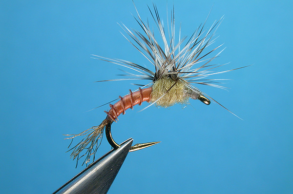 | Hackle: | Grizzly hackle, wound around a post of 7x leader material and then pulled over the dubbed thorax, stacker style |
