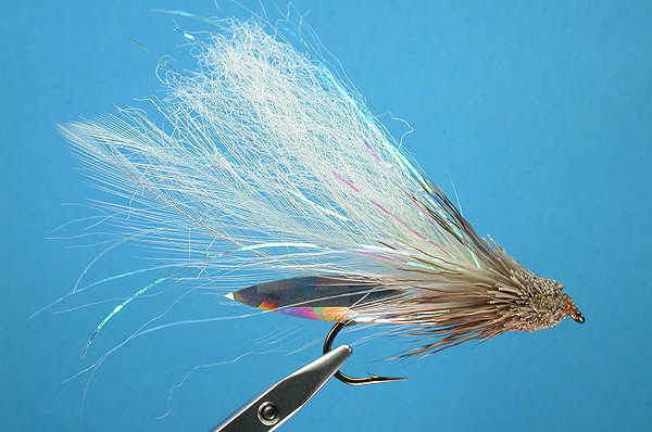 Bottom to top: two white hackles, white synthetic hair and Spectraflash strands
