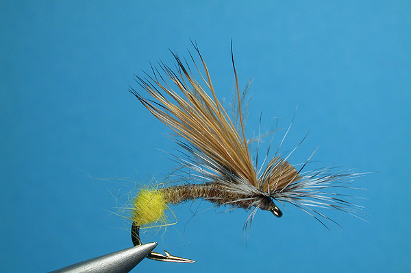 Pattern information Vary the colours of the materials to imitate different Caddis hatches in your waters. The purpose of the deer hair is to keep the CDC down and make a base for the parachute-style hackle. Be sure to tie in the hackle first, splay the CDC feathers flat over the body, tie on the deer hair sparsely, then wind the hackle as the final step. The joint of the deer hair will give you a post around which to tie the parachute hackle. |