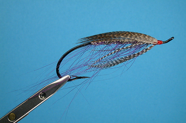 Note: A quick, easy spey fly that is easy to adapt to many different conditions by changing the braid and hackle colours. This was initially designed after losing a few "Purple Kings" that had taken a good deal of time to tie. This is not so regal, hence called a "Commoner", and does not provoke the same heartbreak if it winds up on a log or under a rock.