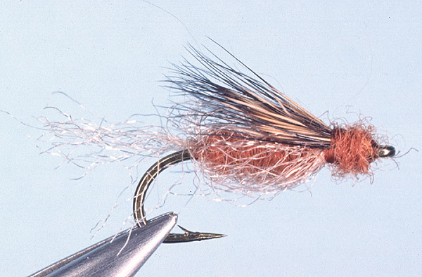 | Body: | Rust dubbing with Antron sparkle yarn pulled over in "bubble" form |