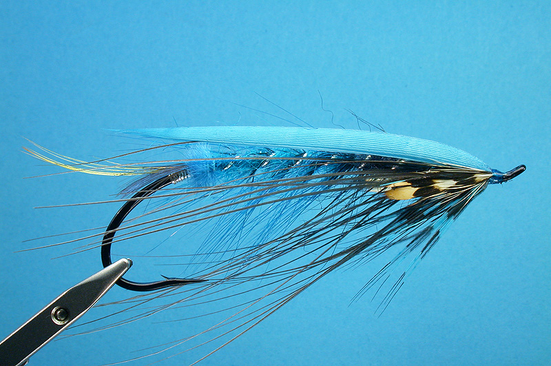 rear half – badger neck hackle dyed kingfisher blue; front half – heron or natural blue-eared pheasant or substitute |