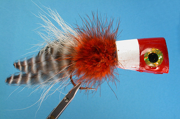 Note: This fly was created out of a need to fish the Hex on a 2 fly rig. The buoyancy of the fly is fantastic. Silver, Black, and the standard White/Red combo work best for me. Fantastic on post-spawn fish, the Pinot Popper’s head can be cut to spit, gurgle, and pop. A Dremel tool makes the removal of material a breeze. The dubbed hook is epoxied into the cork making an extremely durable fly that even stands up to stripers. My wife says that I only drink wine to supply my tying. Pinot’s from Loius Jadot have the best cork!