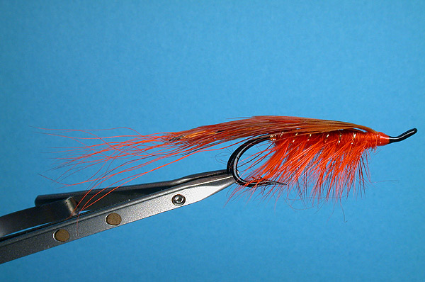 | Tail: | Hot orange bucktail veiled by Golden pheasant breast feathers |