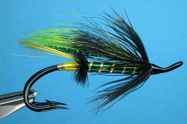 | Wing: | Green Krystal Flash (short) under dyed green grey squirrel tail |