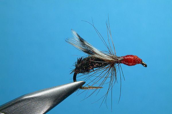 | Wings: | Grizzly hackle tips - slanted back at 45 degrees |