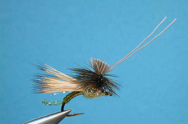 | Hackle: | Grizzly or to match body, undersized, and tied parachute style |