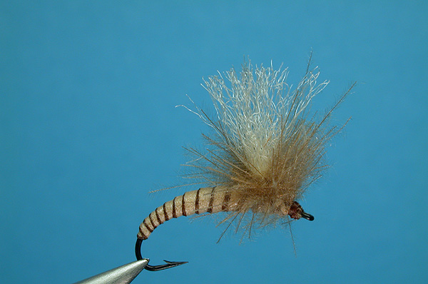 | Hackle: | Beige CDC in a dubbing loop, and wrapped as a parachute hackle |