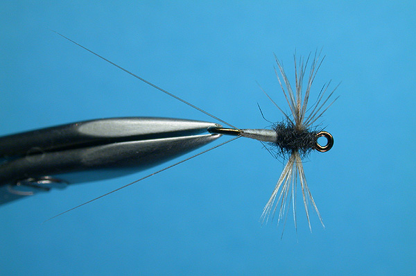 | Loopwing: | 4-5 winds of hackle, color to match natural, gathered with tying thread toward an ultimate shape of fanned wings that lay to either side at about a 120 degree angle to one another |