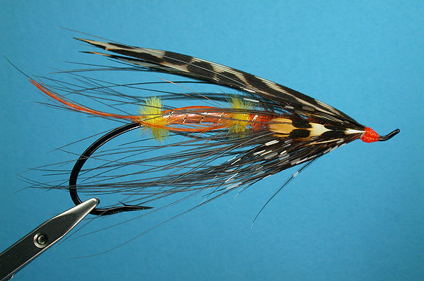 pink ostrich herl to separate the front and rear portions Hot pink dubbing, SLF, with pink spey hackle wound forward behind the rib. |