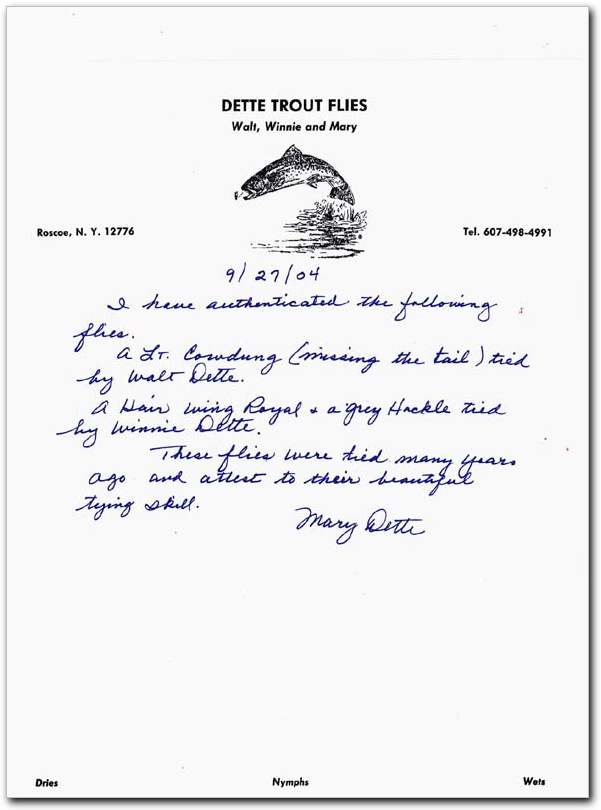 My search ended with Mary Dette, daughter of Walt and Winnie Dette. She positively identified the 3 sample flies I sent her, from both the workmanship of the flies and her father’s handwriting on the Mason box lids. Of the 3 sample flies that I sent to her, Mary identified the Cowdung as being tied by Walt, and the Hair Wing Royal Coachman and Grey Hackle as being tied by Winnie. She was gracious enough to send me a letter of authentication and patient enough to tolerate the subsequent phone calls that I made to her asking some follow up questions.